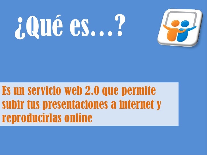 esta aplicación de web 2.0 es muy útil, puesto que nos permite administrar una cuenta donde archivar ,publicar , difundir nuestras presentaciones los beneficios de este servicio radican en la alternativa de compartirla si necesidad de adjuntar el archivo pesado en nuestro E-MAIL publicarlos en un sitio web o blog (gracias al código HTML desde donde también accedemos a modificar el tamaño de visualización de la presentación ) .